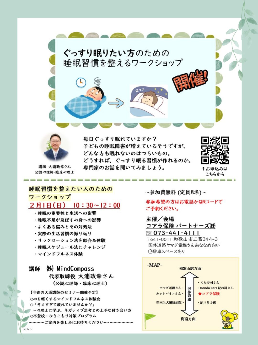 2026.01.21 イベント情報 睡眠習慣を整えたい人のためのワークショップ開催のご案内 イベント詳細 主催 コアラ保険パートナーズ株式会社 開催日 2026年02月01日(日) 開催時間 ①10:30~12:00 会場 コアラ保険パートナーズ株式会社 定員 8名様 料金 参加費無料 申し込む 一覧に戻る